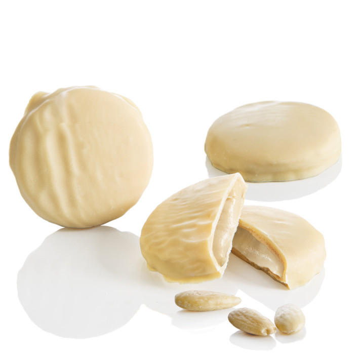 Ingredienti: crema gusto mandorla (59%) (edulcorante: maltitolo (E965); proteine isolate di siero del latte, burro di karitè, proteine di soia, oli e grassi vegetali (olio di girasole, burro di cacao, olio di cartamo), emulsionante: lecitina di soia (E322); aromi), cioccolato bianco con edulcorante (10%) (burro di cacao, latte intero in polvere, emulsionante: lecitina di soia (E322); edulcorante: maltitolo (E965); aroma naturale di vaniglia), burro di cacao, proteine del latte, farina di riso, fecola di patate, amido di mais, olio di girasole alto oleico, emulsionante: lecitina di girasole (E322); agenti lievitanti: bicarbonato di sodio (E500(ii)), bicarbonato d’ammonio (E503(ii)). Contiene: latte e prodotti a base di latte (compreso lattosio), soia e prodotti a base di soia. Possibili tracce di: uova, frutta a guscio (nocciole, pistacchi), arachidi. Contiene polioli: un consumo eccessivo può avere effetti lassativi.